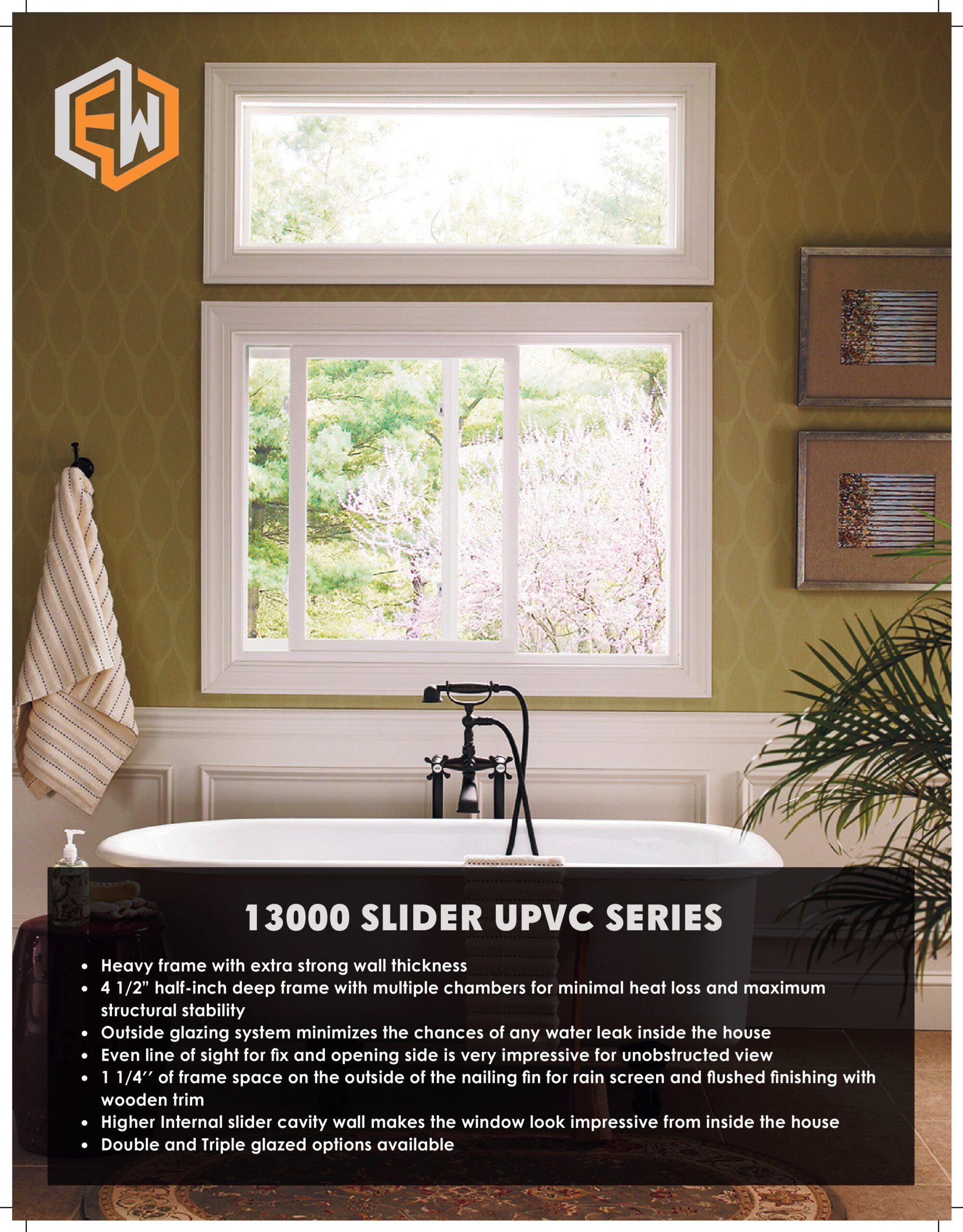 The 13000 Slider uPVC Series features a heavy 4½″ multi-chamber frame for strength and insulation, an exterior glazing system to prevent leaks, clean sightlines for better views, and a 1¼″ outer frame space for proper rain-screen finishing. It offers an enhanced interior look with a higher slider cavity and comes in both double and triple glazing options.